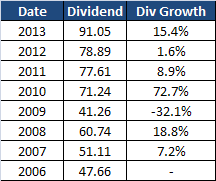 Since 2006 the average annual dividend growth has been 13.2% which is especially pleasing when you consider that this period includes 2009 when it slashed it’s dividend (down 32% on the 2008 payout) due to the global financial crisis.
