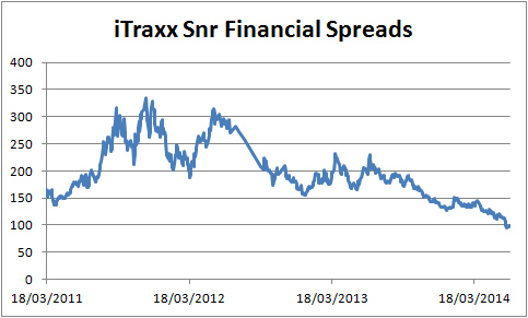 The chart below shows the credit spreads of the iTraxx Snr Financials Index – an index of European financials such as HSBC, Lloyds TSB, RBS, Allianz, BNP Paribas, Credit Suisse etc. The charts clearly shows that credit spreads have been in decline which in other words the market views these institutions as less risk than over the last two years. Great news for investors right? Well I’m afraid that I don’t buy it.